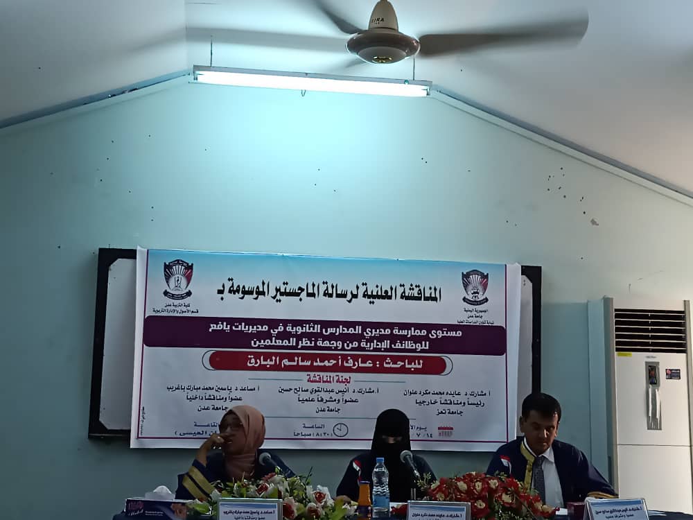 احتضت القاعة الكبرى في كلية التربية جامعة عدن صباح اليوم الاربعاء 14يوليو 2021م مناقشة رسالة الماجستير المقدمه من الباحث الاستاذ عارف احمد سالم البارق احد معلمي مديرية الحد يافع بعنوان مستوى ممارسة مديري المدارس الثانوية في مديريات يافع للوضائف الادارية من وجهة نظر المعلمين